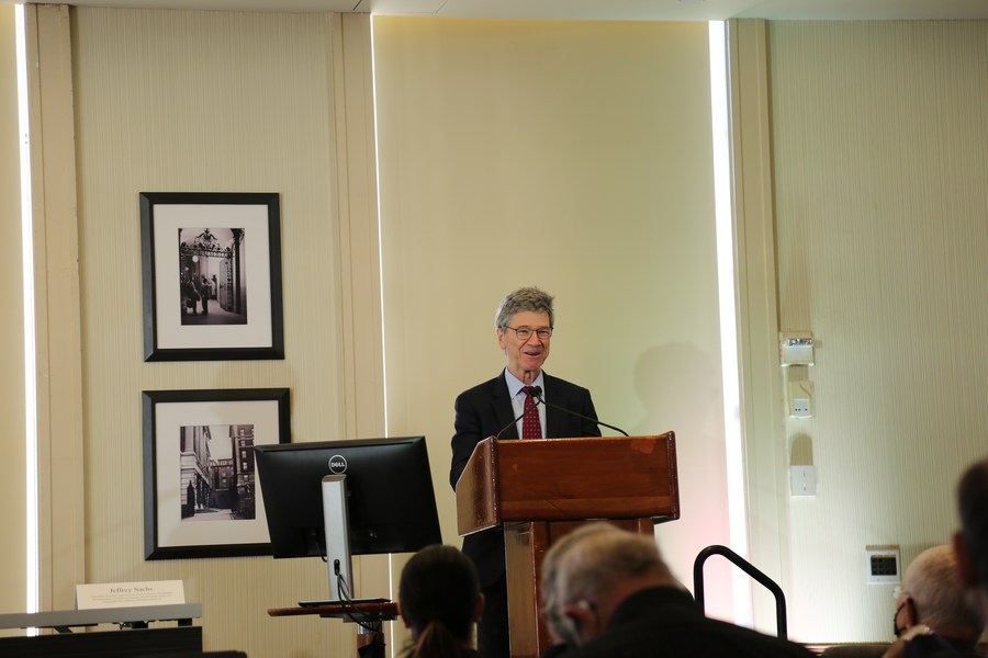 Jeffrey Sachs, director of the Center for Sustainable Development at Columbia University, speaks at a symposium of the university in New York, the United States, Nov. 5, 2021.(Xinhua/Liu Yanan)