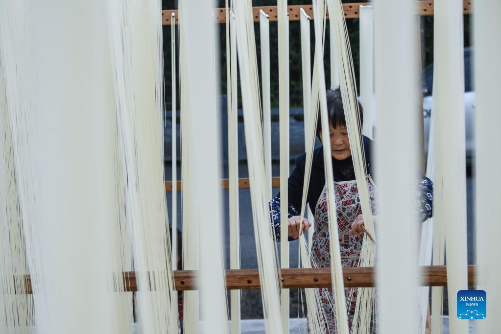 A villager dries handmade noodles in Huyuan Township of Fuyang District, Hangzhou City, east China's Zhejiang Province, Nov. 16, 2021. Noodle culture festival, noodle making activity, intangible cultural heritage performance and other events have been held in Huyuan Township in recent years, as efforts to promote the development of agricultural and rural tourism industries. (Xinhua/Xu Yu)