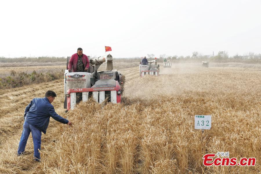 Workers harvest seawater rice developed by the late scientist Yuan Longping and his team at a planting base in Jinghai District, north China's Tianjin municipality, Nov. 15, 2021. (Photo: China News Service/Tong Yu)