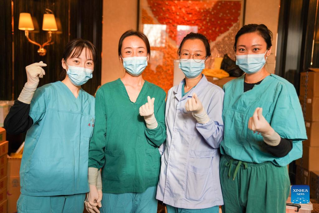 Liu Bing (1st L) and her colleagues pose for photos near a nucleic acid test laboratory named Huoyan, or Fire Eye, in Heihe City, northeast China's Heilongjiang Province, Nov. 15, 2021. Liu Bing, a 24-year-old medical worker, acts as a real "virus detective" in the fight against the latest COVID-19 resurgence in Heihe City. The city reported new locally transmitted COVID-19 cases on Oct. 27. Since then, Liu joined other 32 medical workers for nucleic acid testing tasks. Dressed head to toe in protective clothing, Liu has been working around the clock for COVID-19 testing, such as extracting nucleic acid from swab samples. Her body was often drenched in sweat by wearing thick protective suits. "I need to be responsible for each sample, which is to be responsible for people in the city. I must be extremely cautious," Liu, a Heihe local said. (Xinhua/Wang Song)