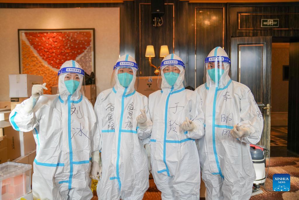 Liu Bing (1st L) and her colleagues pose for photos near a nucleic acid test laboratory named Huoyan, or Fire Eye, in Heihe City, northeast China's Heilongjiang Province, Nov. 15, 2021. Liu Bing, a 24-year-old medical worker, acts as a real "virus detective" in the fight against the latest COVID-19 resurgence in Heihe City. The city reported new locally transmitted COVID-19 cases on Oct. 27. Since then, Liu joined other 32 medical workers for nucleic acid testing tasks. Dressed head to toe in protective clothing, Liu has been working around the clock for COVID-19 testing, such as extracting nucleic acid from swab samples. Her body was often drenched in sweat by wearing thick protective suits. "I need to be responsible for each sample, which is to be responsible for people in the city. I must be extremely cautious," Liu, a Heihe local said. (Xinhua/Wang Song)