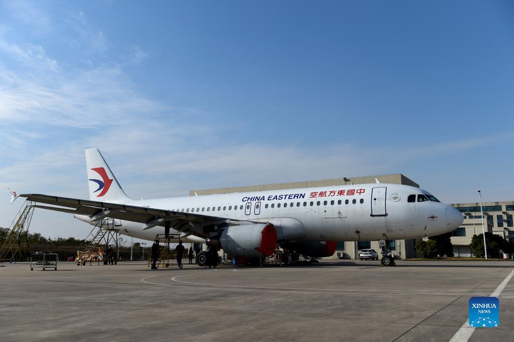 Technicians dismantle an aircraft at Hefei Xinqiao International Airport in Hefei, east China's Anhui Province, Nov. 15, 2021. Technicians from Anhui Branch of China Eastern Airlines Technic Co., Ltd. have been dismantling a retired Airbus A320 aircraft, which has been in service for 22 years. Aircraft dismantling is a high-tech industrial project of circular economy, which is a measure to promote green and low-carbon development. (Xinhua/Huang Bohan)
