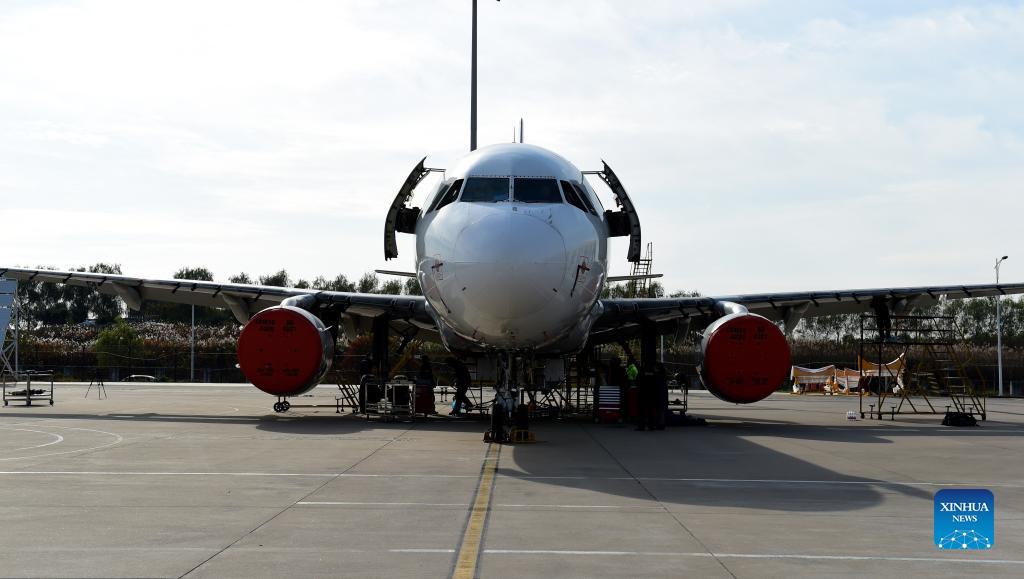 Technicians dismantle an aircraft at Hefei Xinqiao International Airport in Hefei, east China's Ahhui Province, Nov. 15, 2021. Technicians from Anhui Branch of China Eastern Airlines Technic Co., Ltd. have been dismantling a retired Airbus A320 aircraft, which has been in service for 22 years. Aircraft dismantling is a high-tech industrial project of circular economy, which is a measure to promote green and low-carbon development. (Xinhua/Huang Bohan)