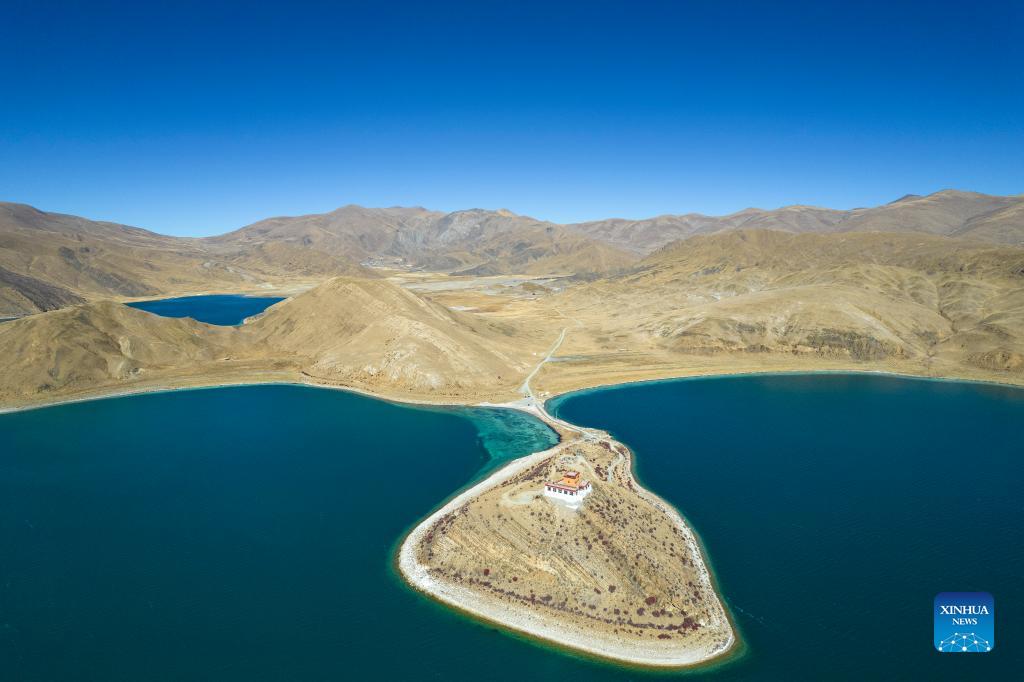 Photo taken on Nov. 16, 2021 shows the Yamzbog Yumco Lake and the nearby villages in Shannan, southwest China's Tibet Autonomous Region. (Xinhua/Sun Ruibo)