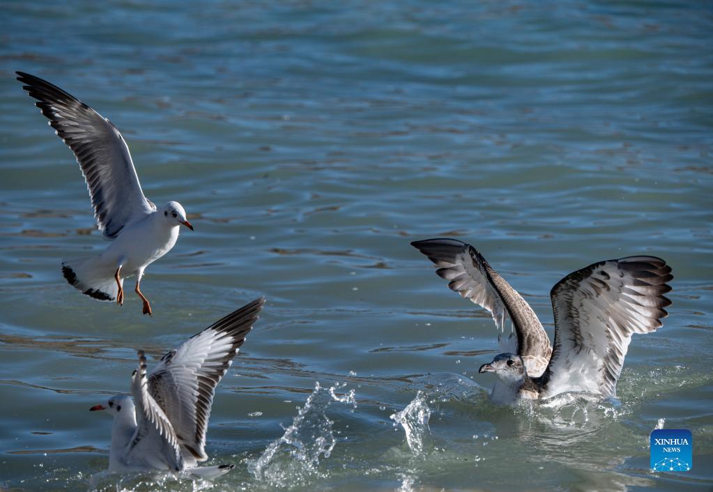 Photo taken on Nov. 16, 2021 shows birds on the Yamzbog Yumco Lake in Shannan, southwest China's Tibet Autonomous Region. (Xinhua/Sun Fei)