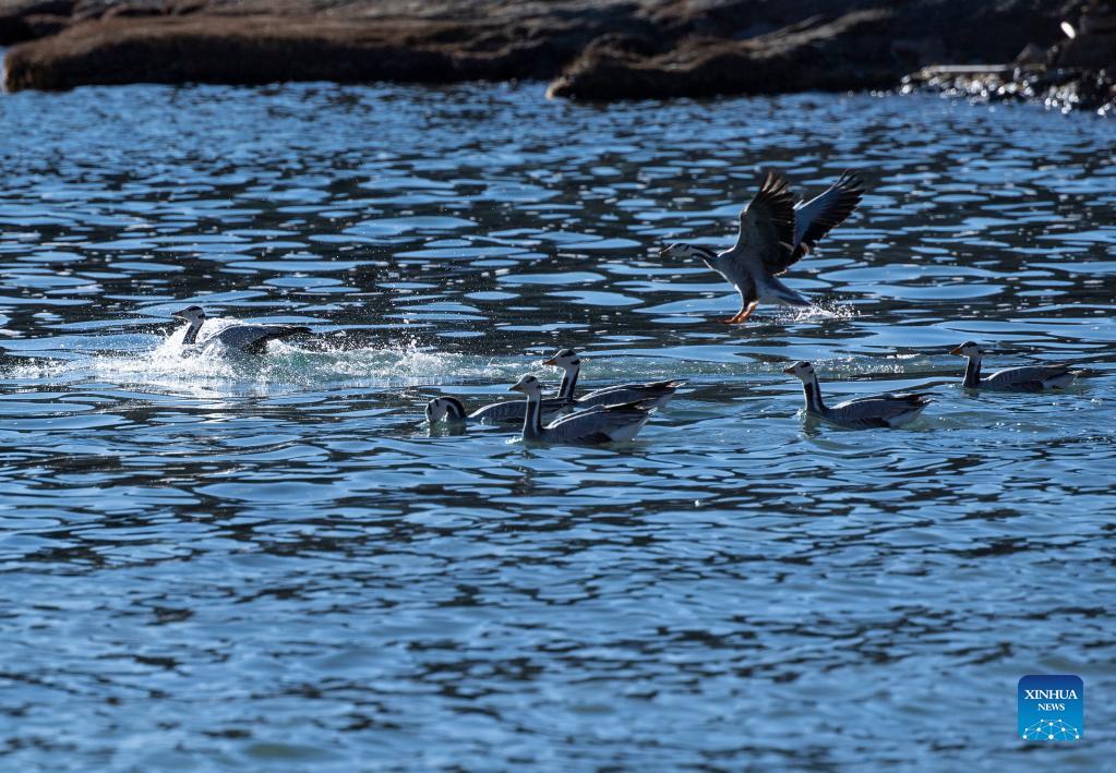 Bar-headed geese fly over the Yamzbog Yumco Lake in Shannan, southwest China's Tibet Autonomous Region, Nov. 16, 2021. (Xinhua/Sun Fei)