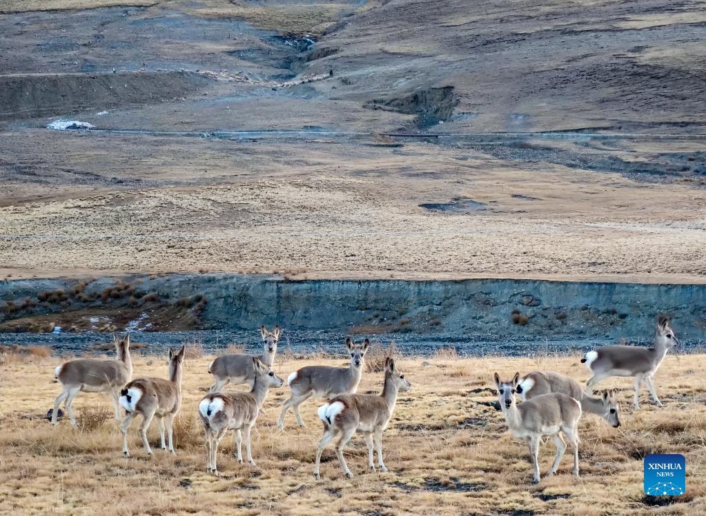 Photo taken on Nov. 16, 2021 shows Tibetan gazelles along the Yamzbog Yumco Lake in Shannan, southwest China's Tibet Autonomous Region. (Xinhua/Sun Ruibo)