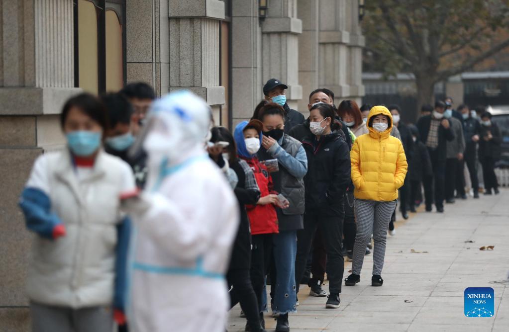 People wait in line at a nucleic acid testing site in Dalian, northeast China's Liaoning Province, Nov. 17, 2021. Dalian on Wednesday started a new round of citywide nucleic acid testing to curb the spread of COVID-19. (Xinhua/Yao Jianfeng)