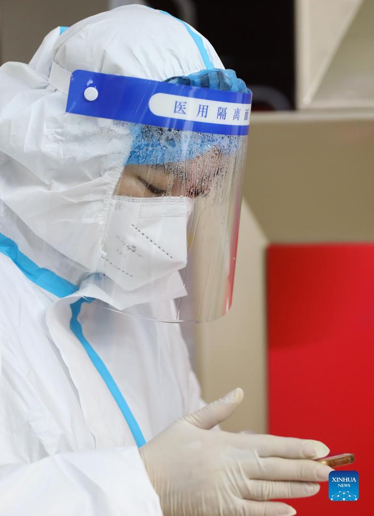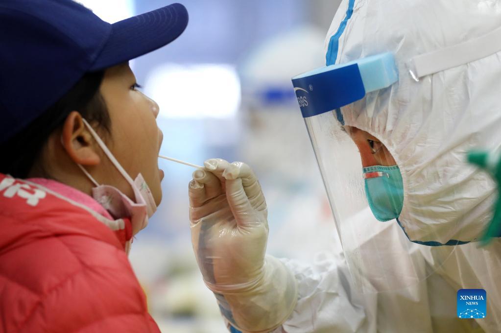 A medical worker takes a swab sample from a resident for nucleic acid test at a testing site in Dalian, northeast China's Liaoning Province, Nov. 17, 2021. Dalian on Wednesday started a new round of citywide nucleic acid testing to curb the spread of COVID-19. (Xinhua/Yao Jianfeng)
