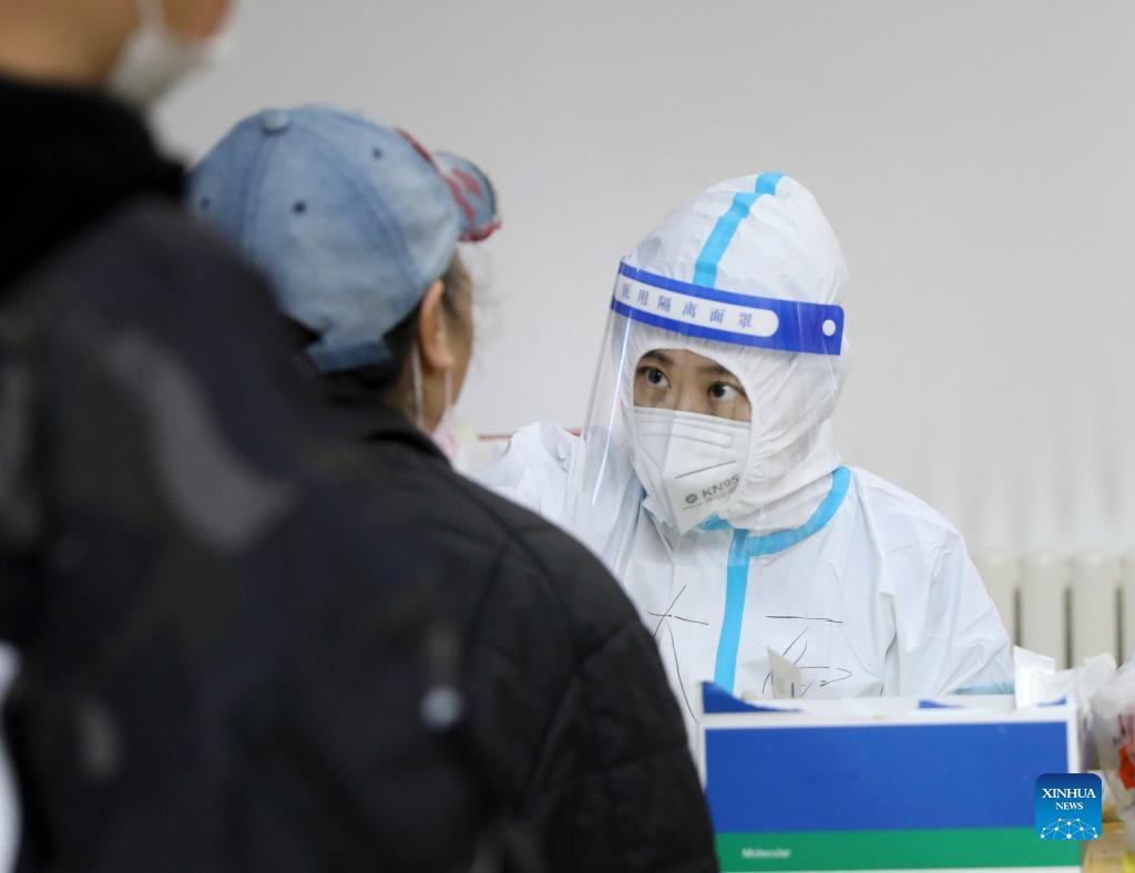 A medical worker registers information for a resident at a nucleic acid testing site in Dalian, northeast China's Liaoning Province, Nov. 17, 2021. Dalian on Wednesday started a new round of citywide nucleic acid testing to curb the spread of COVID-19. (Xinhua/Yao Jianfeng)