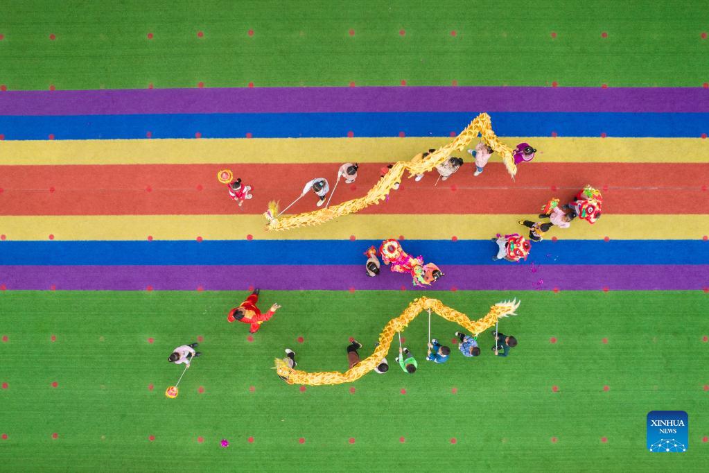Aerial photo shows children learning dragon dance from a folk artist at a kindergarten in Yaotianping Town in Dingcheng District of Changde, central China's Hunan Province, Nov. 17, 2021. The kindergarten invited folk artists to give a dragon dance and lion dance lesson to the children, providing small kids an opportunity to have a close watch on the local intangible cultural heritage. (Xinhua/Chen Sihan)
