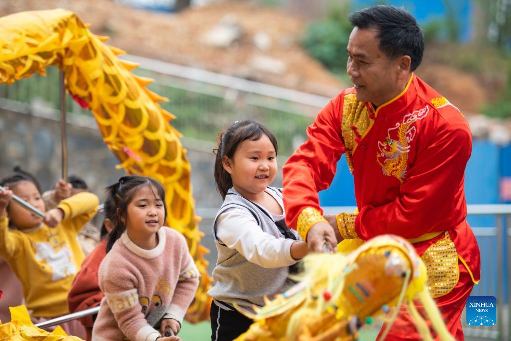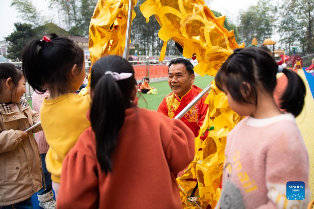Children learn dragon dance from folk artist at kindergarten in Hunan