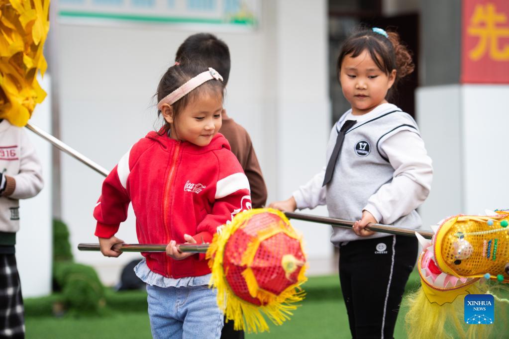 Children practice dragon dance at a kindergarten in Yaotianping Town in Dingcheng District of Changde, central China's Hunan Province, Nov. 17, 2021. The kindergarten invited folk artists to give a dragon dance and lion dance lesson to the children, providing small kids an opportunity to have a close watch on the local intangible cultural heritage. (Xinhua/Chen Sihan)