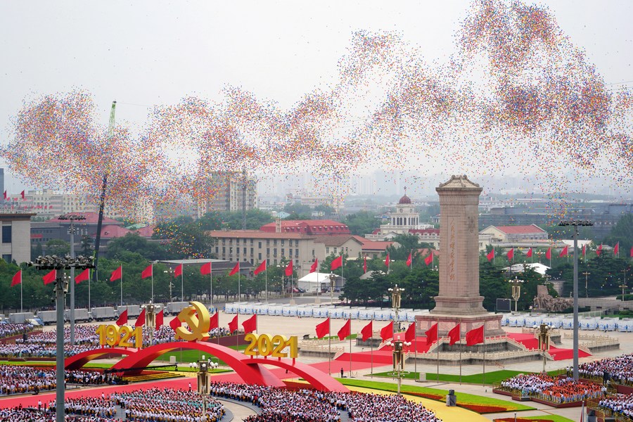 Balloons are released during a ceremony marking the centenary of the Communist Party of China (CPC) at Tian'anmen Square in Beijing, capital of China, July 1, 2021. (Xinhua/Li Gang)