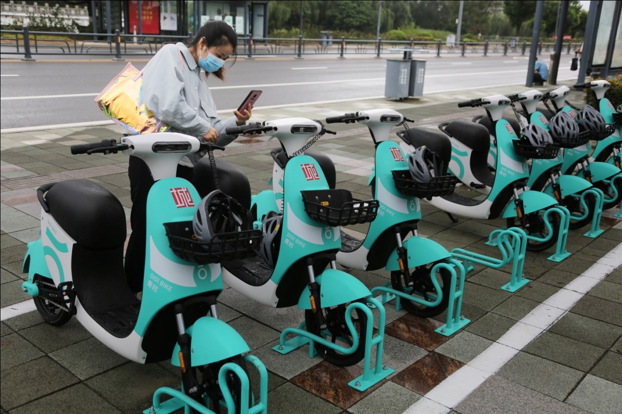 A citizen scans QR code on a shared electric scooter with her mobile phone to use the scooter. On Sept. 1, 2021, the first batch of 500 shared electric scooters were officially put into use in the urban area of Lianyungang, east China’s Jiangsu province. (People’s Daily Online/Wang Chun)