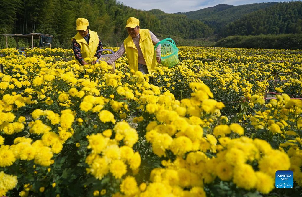 Farmers pick mountain chrysanthemums in Hongxing Village of Nanchang, east China's Jiangxi Province, Nov. 16, 2021. Local farmers are busy with harvesting and processing chrysanthemum flowers in recent days. (Xinhua/Wan Xiang)