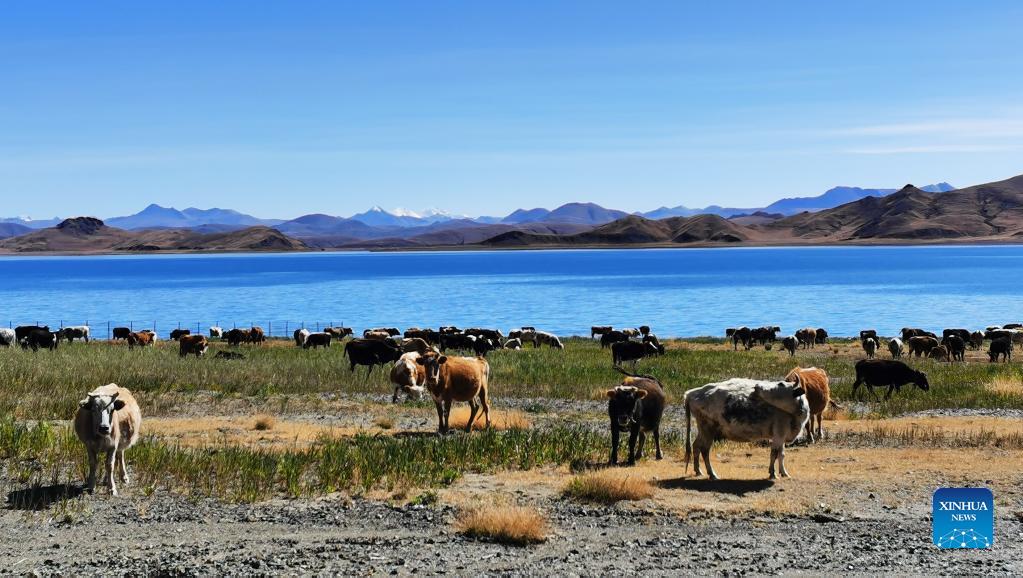 This picture shows the charming view of Yamdrok Lake as winter creeps in. The Yamdrok Lake, which nestles in Nagarze County of Shannan City, southwest China's Tibet Autonomous Region, is one of the three holy lakes in the region. Yamdrok means "jade" in Tibetan, which vividly depicts the limpidity and the fine blue color of the water. (Xinhua/Shen Hongbing)