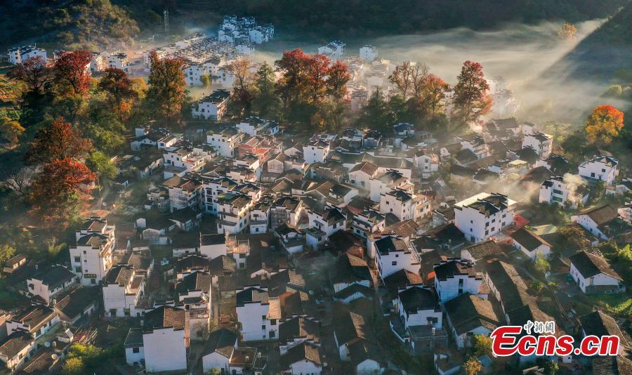 Maple leaves turn red in Shicheng village, East China's Jiangxi Province. Red leaves and white-and-gray-hued Hui-style architecture make a picturesque scenery. (Photo: China News Service/Hu Dunhuang)