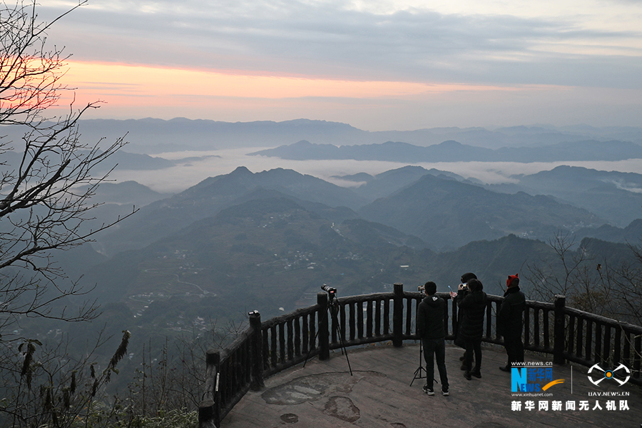 Photo taken on Nov. 15, 2021 shows people watching the sunrise from Mowei Mountain viewing platform in Pengshui Miao-Tujia Autonomous County, southwest China's Chongqing. (Xinhuanet/ZhaoYong)