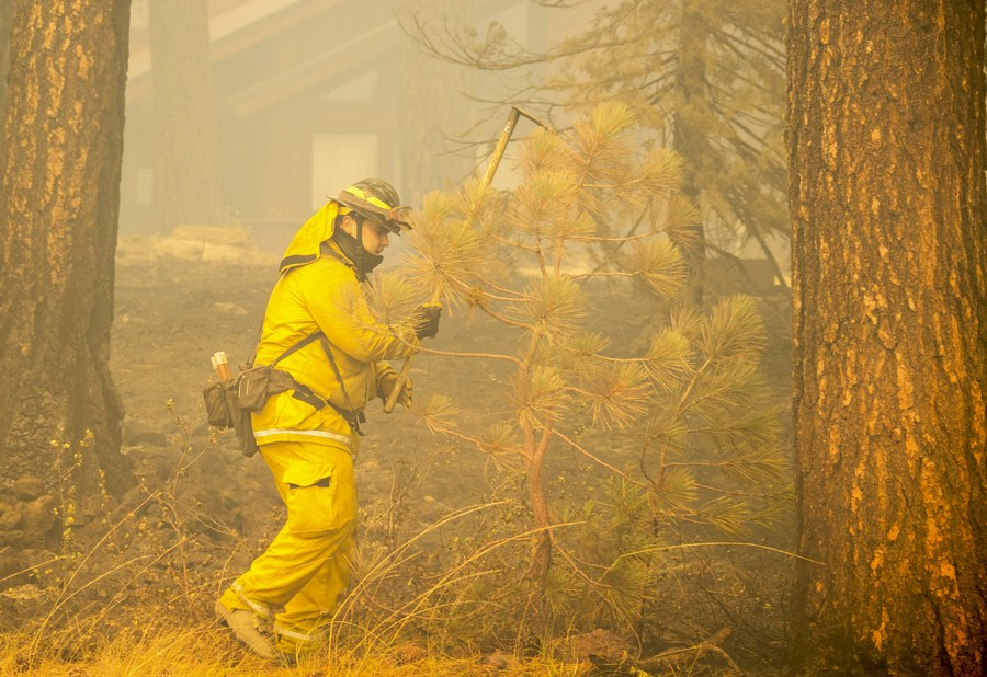 A firefighter battles against a wildfire dubbed Dixie Fire in Lassen National Forest, Northern California, the United States, on Aug. 5, 2021. (Photo by Dong Xudong/Xinhua)