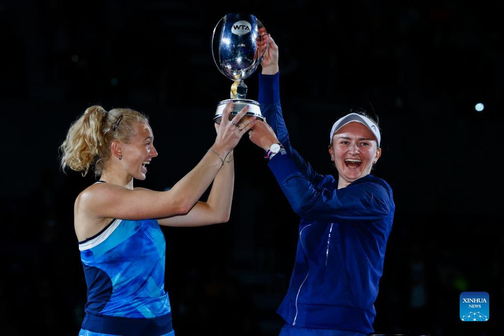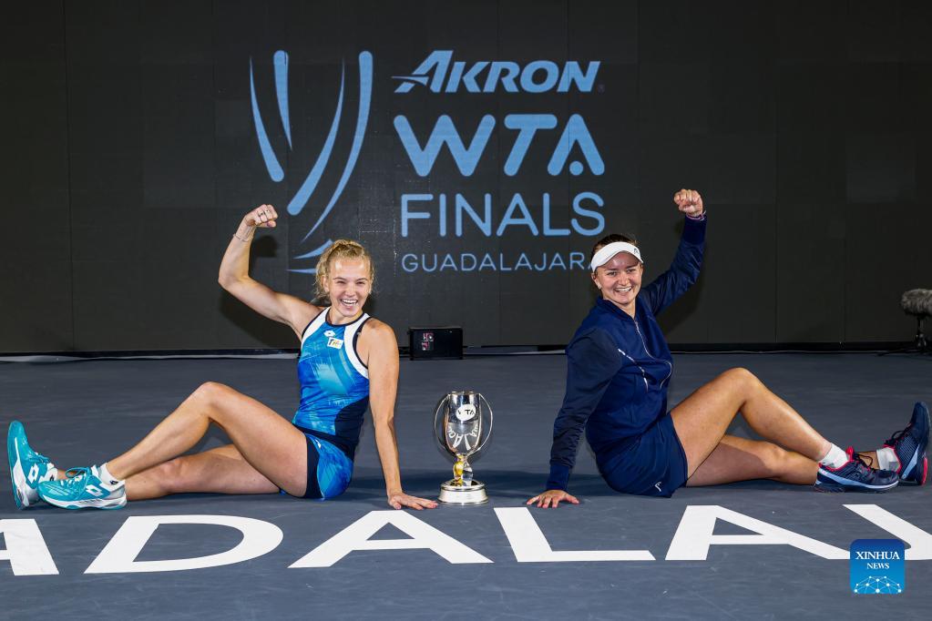 Katerina Siniakova (L) and Barbora Krejcikova of the Czech Republic celebrate with the trophy during the awarding ceremony after winning the women's doubles final against Hsieh Su-Wei of Chinese Taipei and Elise Mertens of Belgium at the AKRON WTA Finals in Guadalajara, Mexico, on Nov. 17, 2021. (Photo by Jorge Reyes/Xinhua)