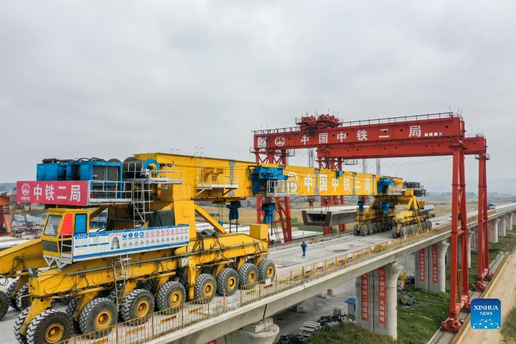 Photo taken on Nov. 18, 2021 shows the construction site of the high-speed railway linking Nanning and Yulin of south China's Guangxi Zhuang Autonomous Region. With a designed speed of 350 km per hour, the Nanning-Yulin high-speed railway is a crucial part of the high-speed railway linking Nanning of Guangxi Zhuang Autonomous Region and Shenzhen of Guangdong Province. (Xinhua/Cao Yiming)