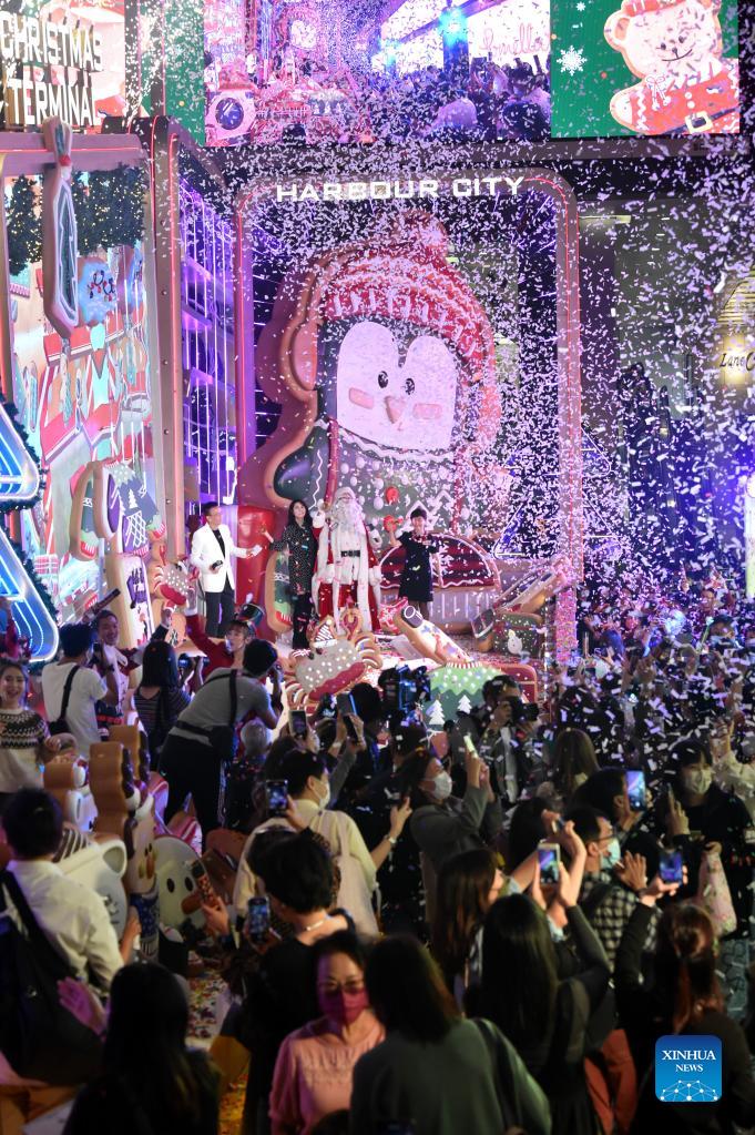People attend a Christmas lighting ceremony at Harbour City shopping mall in south China's Hong Kong, Nov. 18, 2021. (Xinhua/Lo Ping Fai)