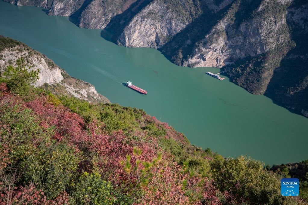 Photo taken in Wushan County, southwest China's Chongqing Municipality on Nov. 18, 2021 shows a ship sailing in the Wuxia Gorge, one of the Three Gorges on the Yangtze River. (Xinhua/Huang Wei)