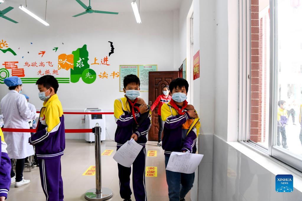Pupils line up to get inoculated with the COVID-19 vaccines at Weiming elementary school in Weiming Village, Shinan Township, Xingye County, south China's Guangxi Zhuang Autonomous Region, Nov. 18, 2021. Local health authorities of Xingye County in Guangxi recently promoted the inoculation of the COVID-19 vaccine on children aged three to eleven in remote rural areas. (Xinhua/Cao Yiming)
