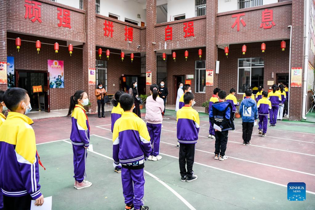 Pupils walk to the observation area after getting inoculated with the COVID-19 vaccines at Weiming elementary school in Weiming Village, Shinan Township, Xingye County, south China's Guangxi Zhuang Autonomous Region, Nov. 18, 2021. Local health authorities of Xingye County in Guangxi recently promoted the inoculation of the COVID-19 vaccine on children aged three to eleven in remote rural areas. (Xinhua/Cao Yiming)