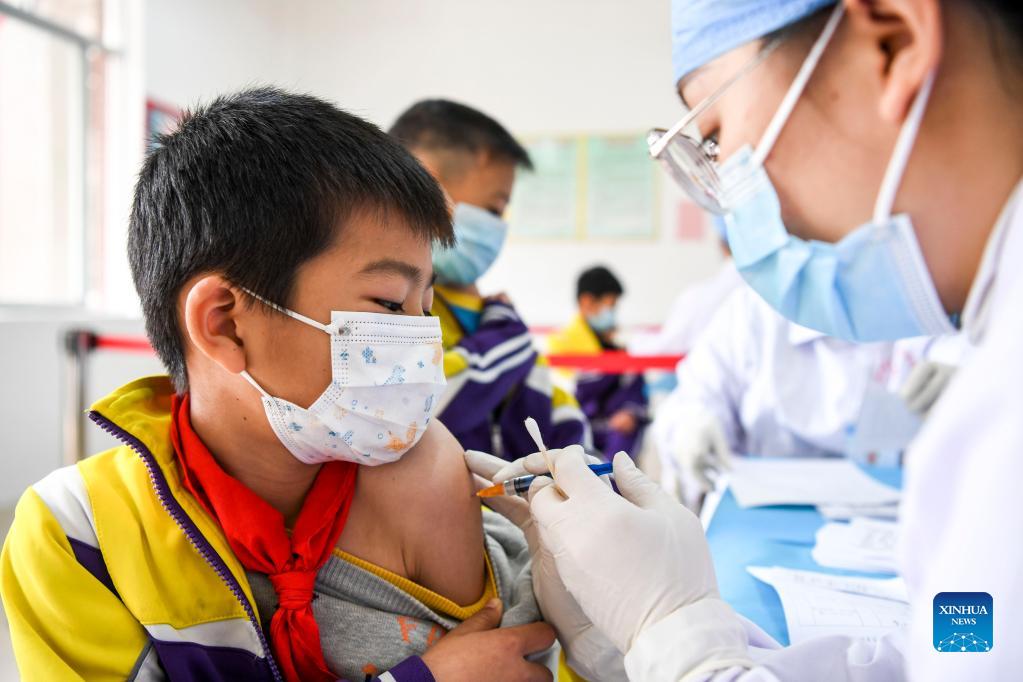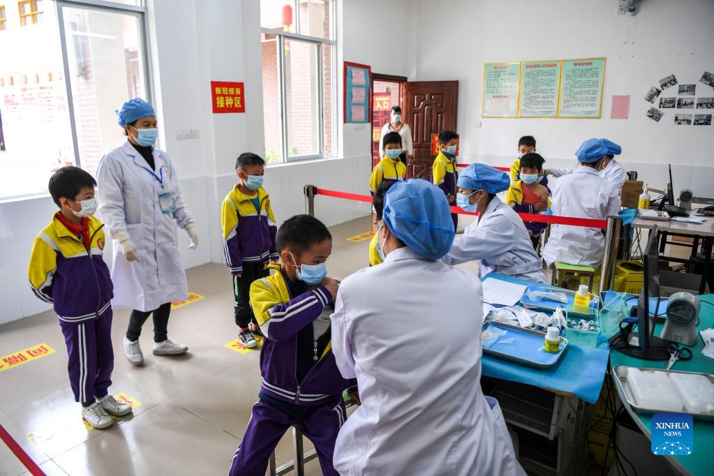 Pupils get inoculated with the COVID-19 vaccines at Weiming elementary school in Weiming Village, Shinan Township, Xingye County, south China's Guangxi Zhuang Autonomous Region, Nov. 18, 2021. Local health authorities of Xingye County in Guangxi recently promoted the inoculation of the COVID-19 vaccine on children aged three to eleven in remote rural areas. (Xinhua/Cao Yiming)