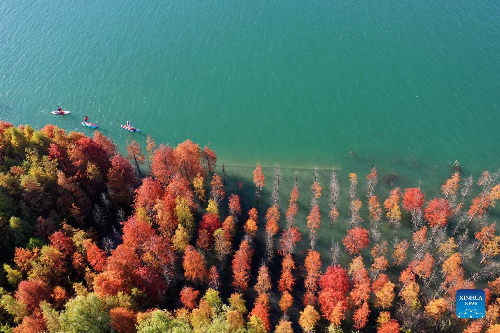 Aerial photo taken on Nov 13, 2021 shows a view of a dawn redwood forest in Zhanghe Reservoir of Jingmen city, Central China's Hubei province. (Photo/Xinhua)