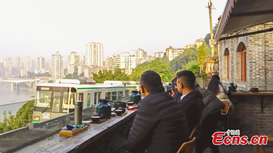 A century-old building on the "three-story road" of Liziba has been transformed into a teahouse, attracting many visitors due to its proximity to the light rail line, Yuzhong District, Southwest China's Chongqing Municipality. (Photo: China News Service/Ouyang Yunjing)