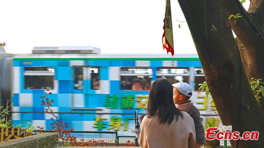 A century-old building on the "three-story road" of Liziba has been transformed into a teahouse, attracting many visitors due to its proximity to the light rail line, Yuzhong District, Southwest China's Chongqing Municipality. (Photo: China News Service/Ouyang Yunjing)