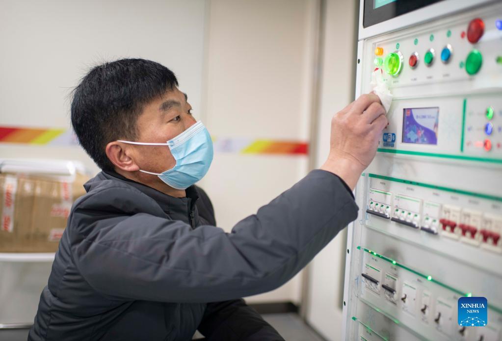 Maintenance crew member Zhang Jian works in the new waxing truck in Wenquan County, northwest China's Xinjiang Uygur Autonomous Region, Nov. 16, 2021. China's very first self-developed waxing truck was deployed during the Chinese national cross-country skiing team training session for the 2022 Olympic Winter Games. It comes with 6 waxing benches, cabins for storaging and other uses. (Xinhua/Hu Huhu)