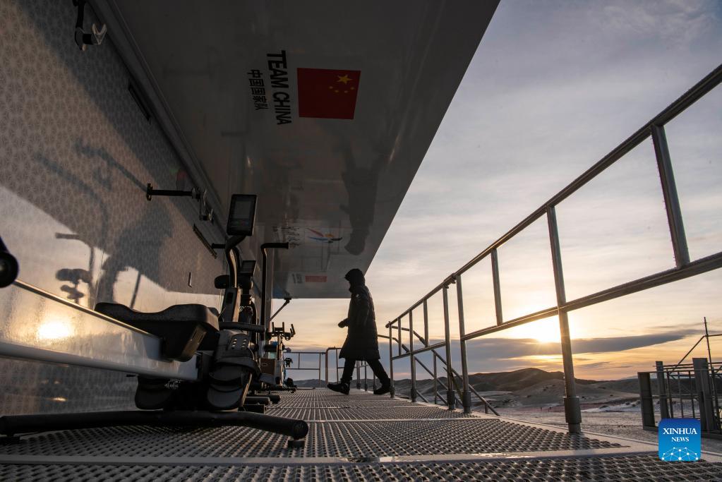 A crew member steps into the new waxing truck in Wenquan County, northwest China's Xinjiang Uygur Autonomous Region, Nov. 17, 2021. China's very first self-developed waxing truck was deployed during the Chinese national cross-country skiing team training session for the 2022 Olympic Winter Games. It comes with 6 waxing benches, cabins for storaging and other uses. (Xinhua/Hu Huhu)