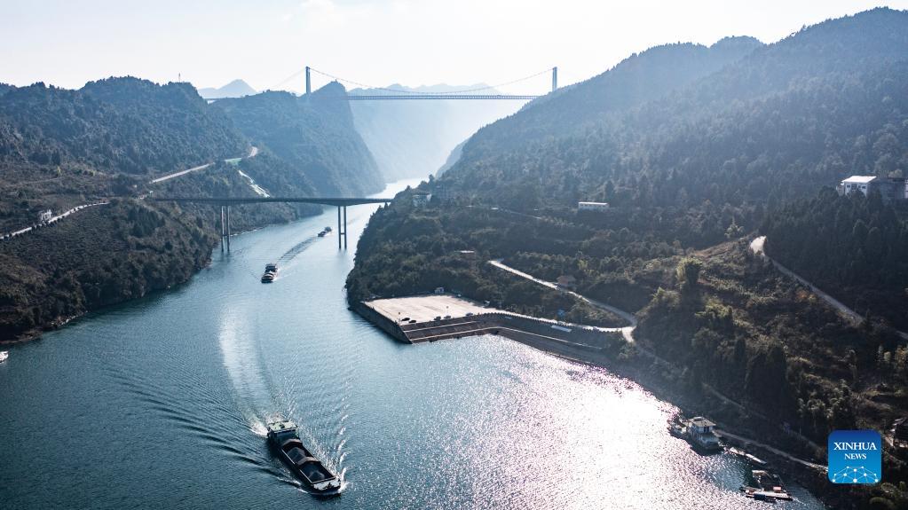 Aerial photo taken on Nov. 19, 2021 shows cargo ships loaded with phosphate ore sailing on the Wujiang River in Sinan County, southwest China's Guizhou Province. The Wujiang River waterway in Guizhou, which had been cut off for nearly 20 years due to the construction of hydropower stations along the river, has fully resumed to traffic recently. (Xinhua/Tao Liang)