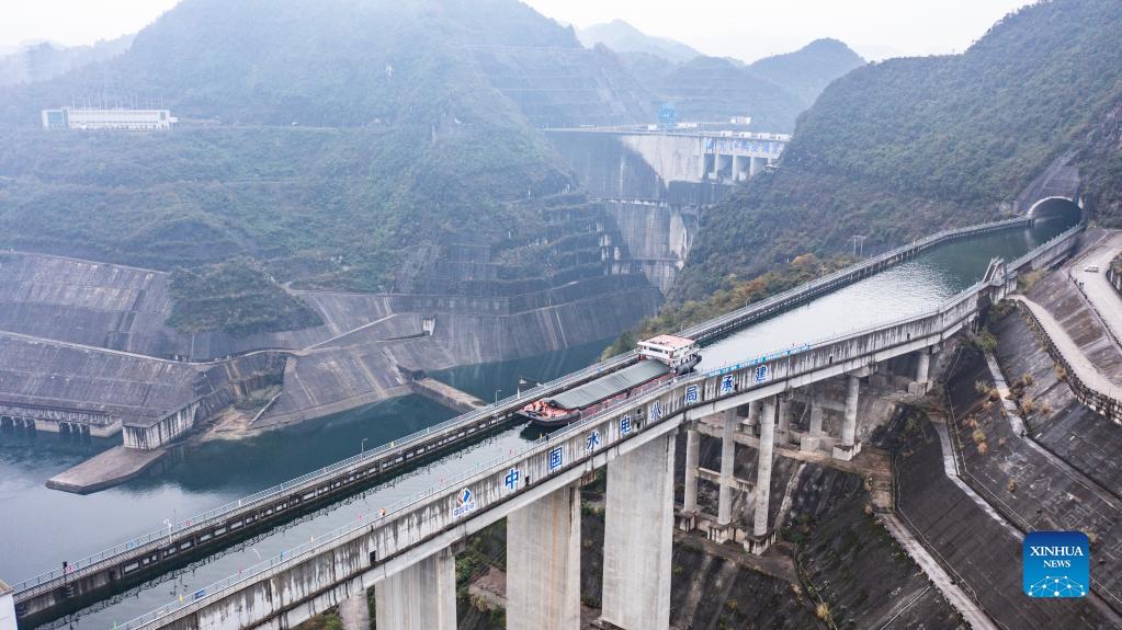 Aerial photo taken on Nov. 17, 2021 shows a cargo ship loaded with phosphate ore sailing through a dam on the Wujiang River in southwest China's Guizhou Province. The Wujiang River waterway in Guizhou, which had been cut off for nearly 20 years due to the construction of hydropower stations along the river, has fully resumed to traffic recently. (Xinhua/Tao Liang)