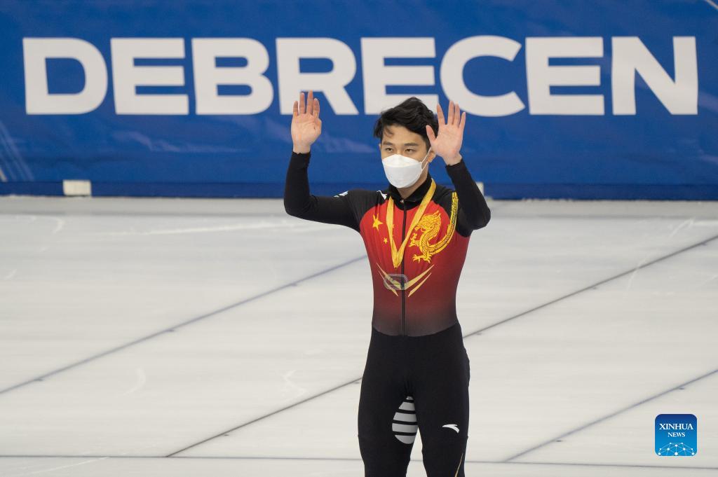 Ren Ziwei of China celebrates victory during the awarding ceremony after the men's 1500m final at the ISU World Cup Short Track Speed Skating series in Debrecen, Hungary, Nov. 20, 2021. (Photo by Attila Volgyi/Xinhua)