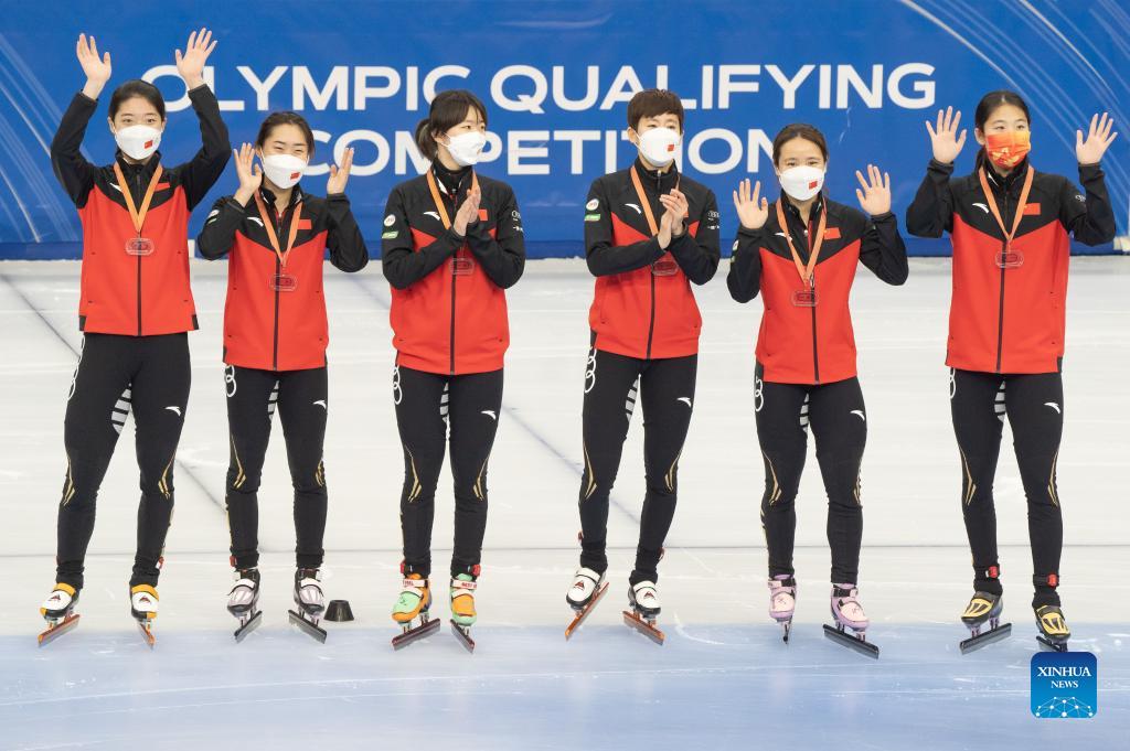 Members of bronze medalists Team China celebrate during the awarding ceremony after the Women 3000 m Relay Final during the ISU World Cup Short Track Speed Skating series in Debrecen, Hungary on Nov. 21, 2021. (Photo by Attila Volgyi/Xinhua)
