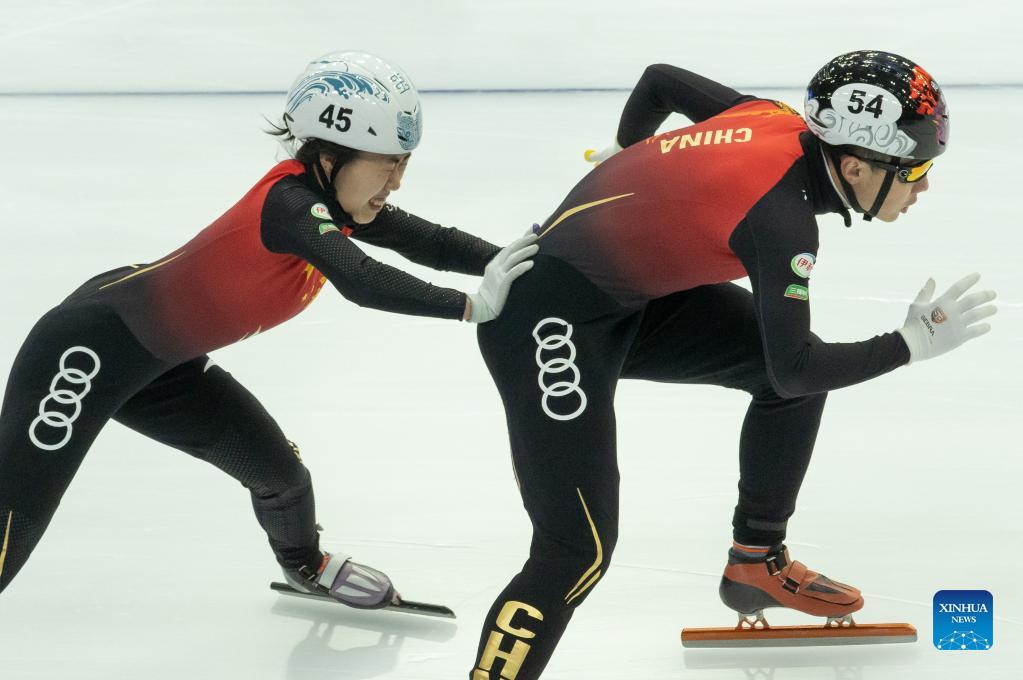 Zhang Yuting (L) of China pushes her teammate Ren Ziwei (R) as they compete in the Mixed 2000 m Relay Final during the ISU World Cup Short Track Speed Skating series in Debrecen, Hungary on Nov. 21, 2021. (Photo by Attila Volgyi/Xinhua)