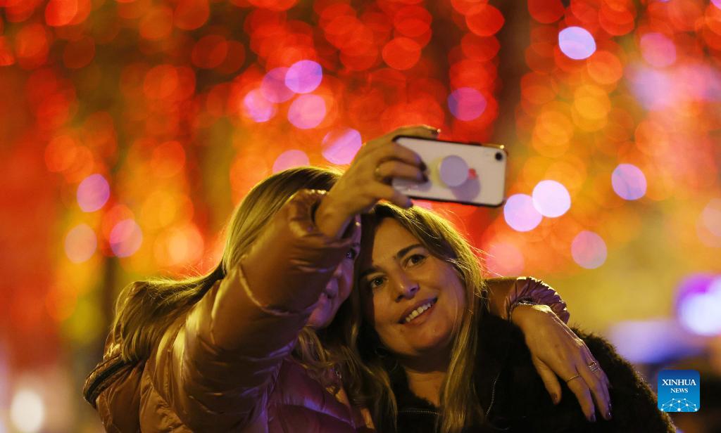People take a selfie on the Champs-Elysees Avenue amid Christmas illuminations in Paris, France, Nov. 21, 2021. The annual Christmas season lighting ceremony was held here on Sunday. (Xinhua/Gao Jing)