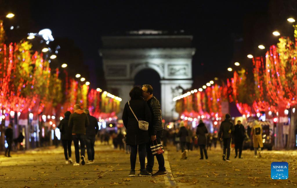 A couple kiss on the Champs-Elysees Avenue amid Christmas illuminations in Paris, France, Nov. 21, 2021. The annual Christmas season lighting ceremony was held here on Sunday. (Xinhua/Gao Jing)