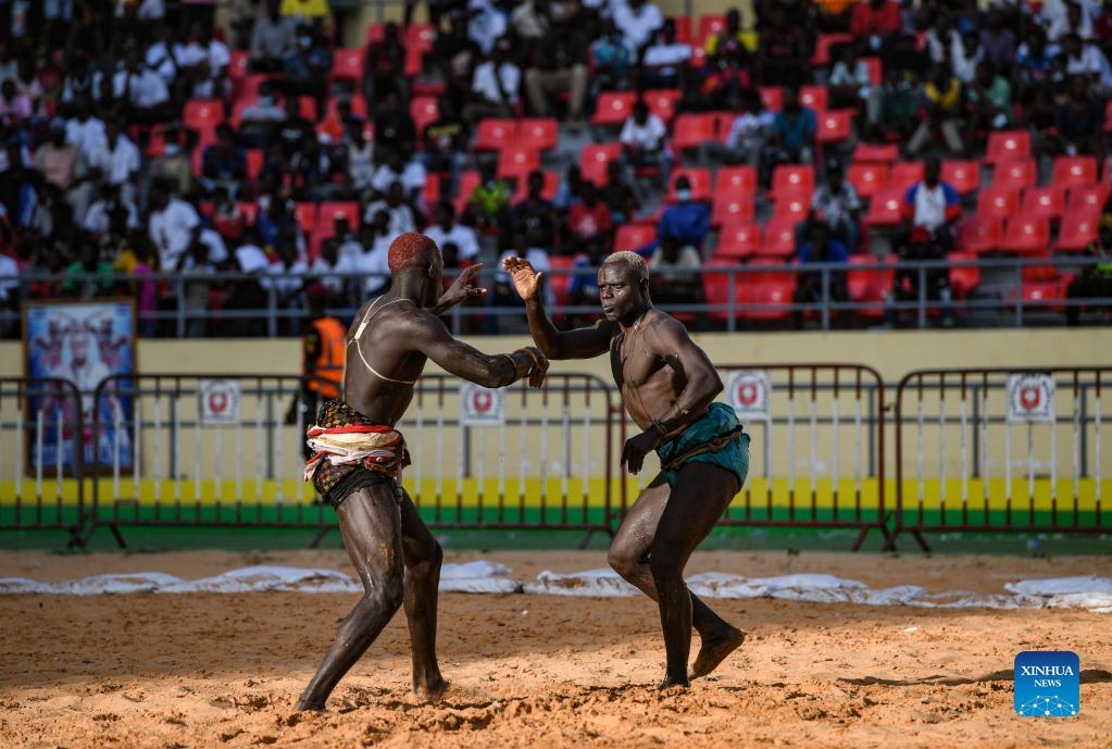 Contestants take part in a wrestling match at the National Wrestling Arena in Dakar, Senegal, Nov. 21, 2021. The arena, the first modern one in Africa, is the largest aid project China has carried out in Senegal. (Xinhua/Li Yan)