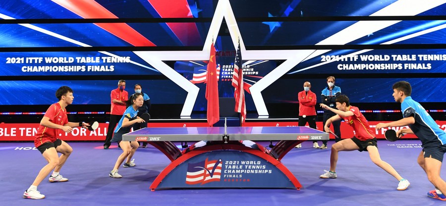 Lily Zhang (1st L) of the United States, Lin Gaoyuan (2nd L) of China compete with Kanak Jha (2nd R) of the United States and Wang Manyu of China during a joint training session of two pairs formed of both American and Chinese players entering the mixed doubles competition at the 2021 World Table Tennis Championships in Houston, the United States, on Nov. 22, 2021. (Xinhua/Wu Xiaoling)