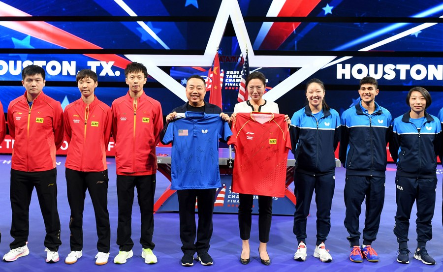 Liu Guoliang (4th L), World Table Tennis Council Chair and president of the Chinese Table Tennis Association exchanges team jersy with Virginia Sung (4th R), Chief Executive Officer of USA Table Tennis during a joint training session of two pairs formed of both American and Chinese players entering the mixed doubles competition at the 2021 World Table Tennis Championships in Houston, the United States, on Nov. 22, 2021. (Xinhua/Wu Xiaoling)