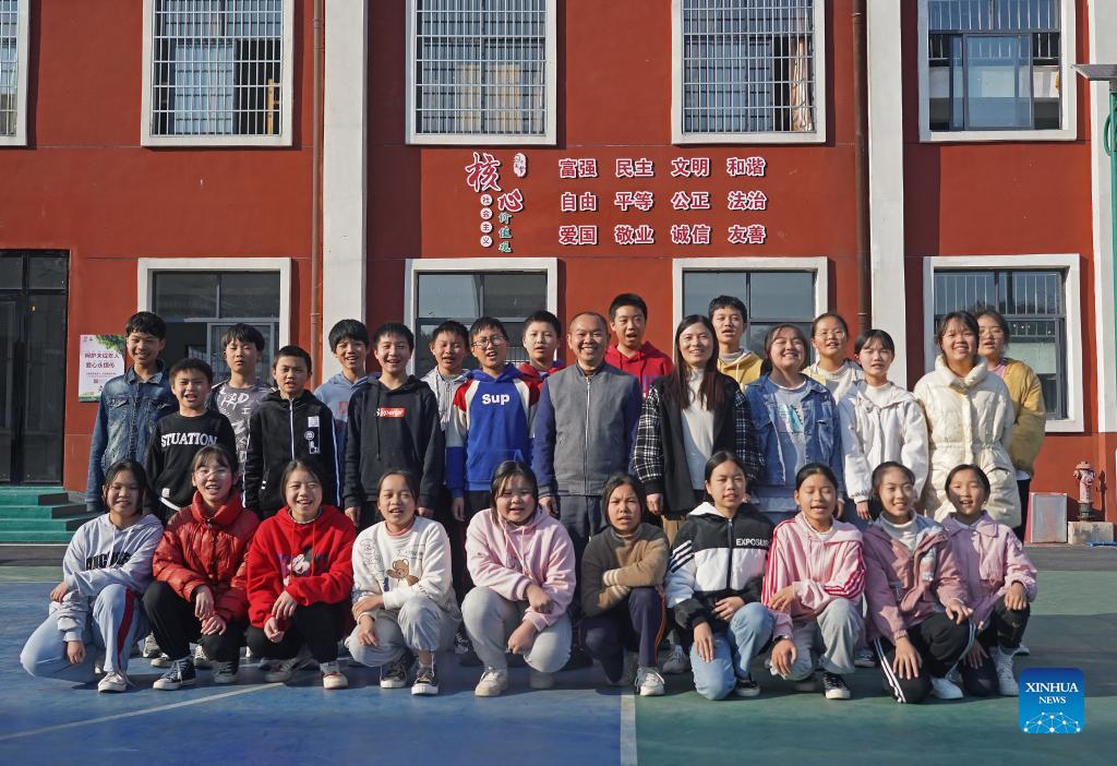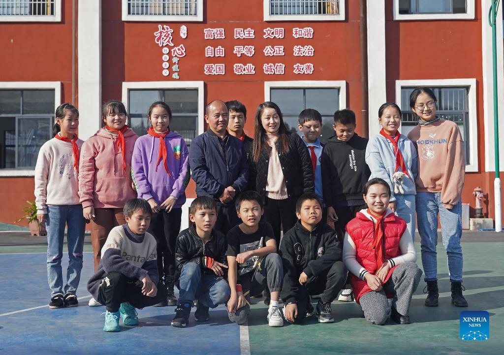 Zhu Bo (L, middle) and his wife Luo Hua, both teachers, pose for a group photo with students at Changfeng School in Luxi County, east China's Jiangxi Province, Nov. 18, 2021. Changfeng School sits deep in the Luoxiao Mountains. Among its 30 teachers, there are six couples. For the 170 students in the school, these couples are not only teachers teaching them knowledge but more like parents taking care of lower graders and boarding students. Wang Jingming, 46, is a chemistry teacher. In 2004, he married Deng Jun, a math teacher at the school. "We have a deep affection for the kids here and we are happy to witness their growth," said Wang. "We are willing to spend our whole lives guarding this school and protecting these kids in the mountains, hoping they can have a wonderful life." (Xinhua/Wan Xiang)