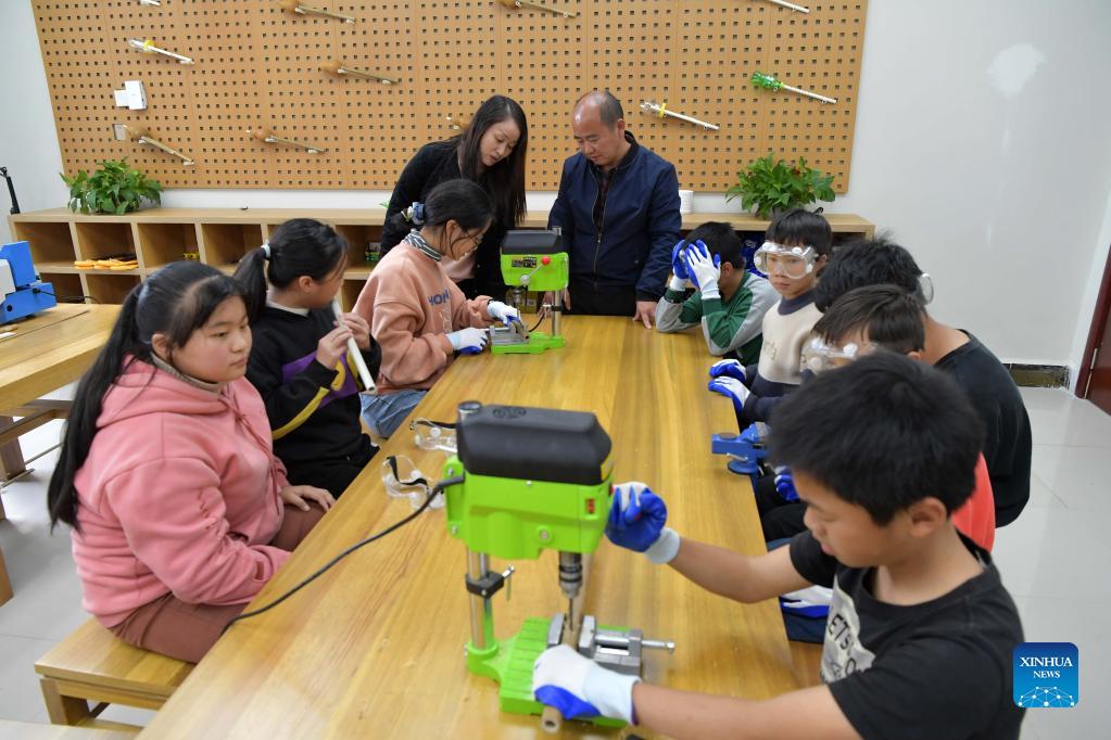 Zhu Bo (R, rear) and his wife Luo Hua (L, rear), both teachers, instruct students to make a musical instrument at Changfeng School in Luxi County, east China's Jiangxi Province, Nov. 18, 2021. Changfeng School sits deep in the Luoxiao Mountains. Among its 30 teachers, there are six couples. For the 170 students in the school, these couples are not only teachers teaching them knowledge but more like parents taking care of lower graders and boarding students. Wang Jingming, 46, is a chemistry teacher. In 2004, he married Deng Jun, a math teacher at the school. "We have a deep affection for the kids here and we are happy to witness their growth," said Wang. "We are willing to spend our whole lives guarding this school and protecting these kids in the mountains, hoping they can have a wonderful life." (Xinhua/Peng Zhaozhi)