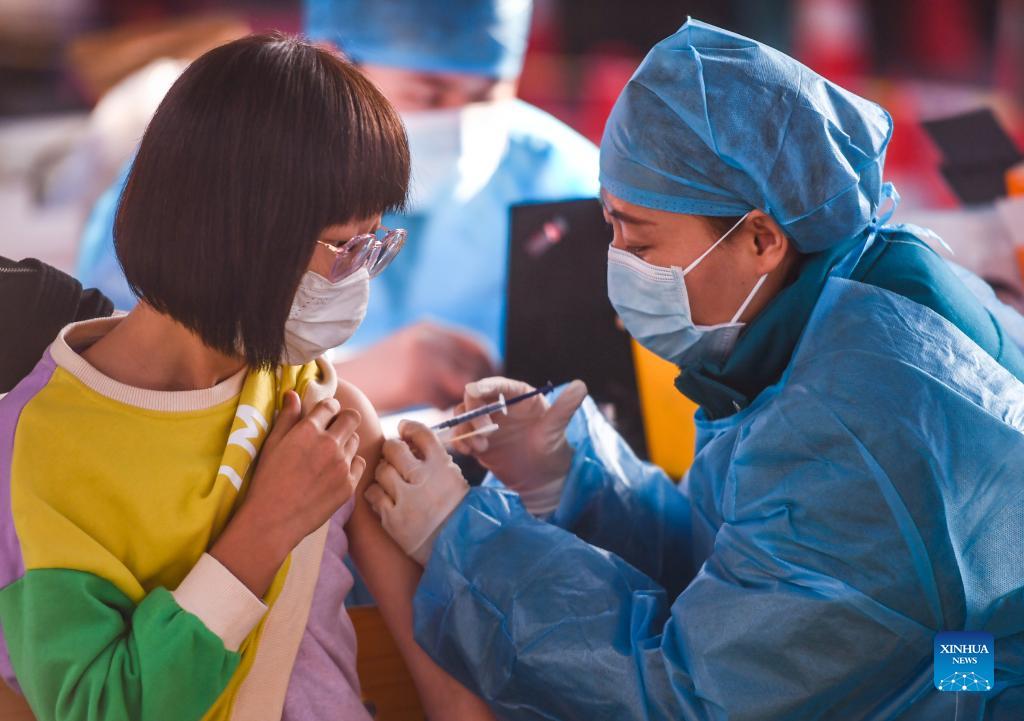 A student receives a dose of COVID-19 vaccine at a school in Hohhot, north China's Inner Mongolia Autonomous Region, Nov. 23, 2021. Hohhot recently launched a COVID-19 vaccination campaign for children aged 3 to 11. (Xinhua/Peng Yuan)