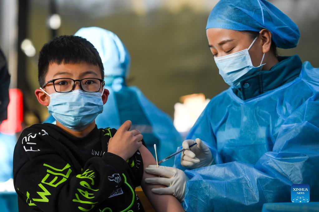 A kid receives a dose of COVID-19 vaccine at a school in Hohhot, north China's Inner Mongolia Autonomous Region, Nov. 23, 2021. Hohhot recently launched a COVID-19 vaccination campaign for children aged 3 to 11. (Xinhua/Peng Yuan)